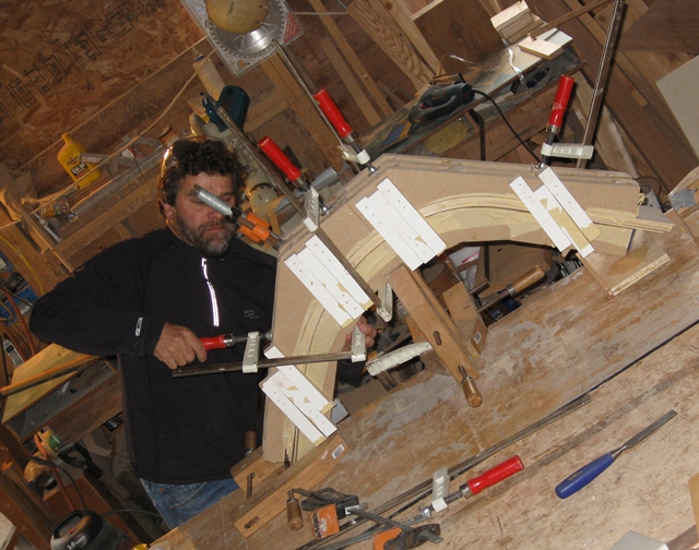 These are laminated pieces of Poplar set into a curved jig that I have made for the specific shape around the client’s detail in their home. Once the glue dries, the two piece jig is taken apart and the detail molding is milled and ready for installation.